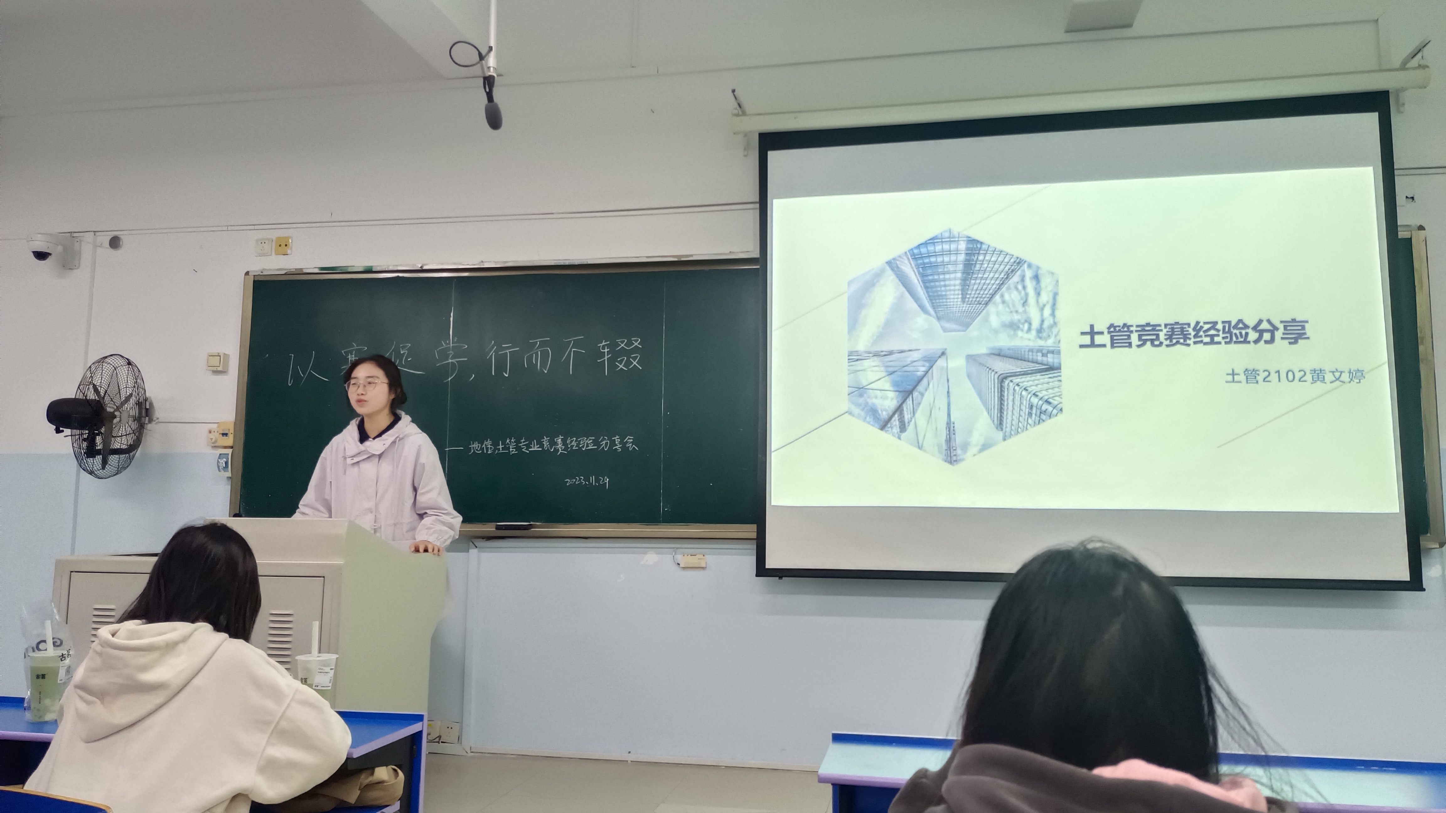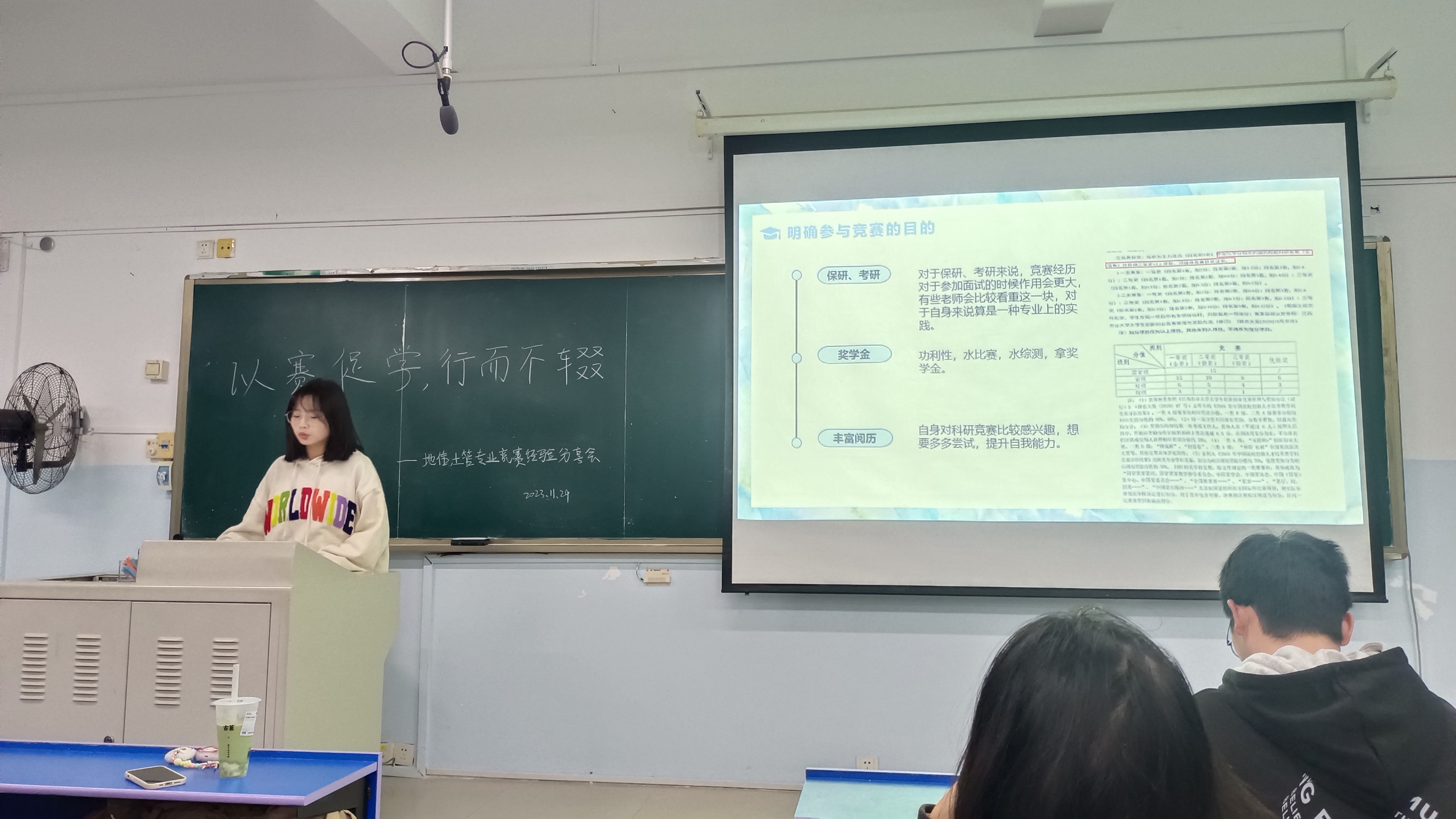 地信2001邵伊雯对地信专业的易智瑞杯中国大学生GIS软件开发以及一些国家级的比赛做了一个完整的介绍以及就比赛前准备和比赛中过程提出了一些建议,例如赛前可以先确定比赛主题,之后确定相应的思路,再做一些数据准备,在比赛时做好数据预处理,运用合理的方法以及编程代码或3D模型;地信2101毕晨铭则对比赛的整个过程阶段分享了自己的经验,以及比赛对于综测保研的加分的重要性;土管2101徐婧仪明确参与竞赛的目的,并分享了自己参加土地国情调查大赛时的亲身经历;土管2102黄文婷则介绍熟练的掌握办公软件,拥有强大的心理承受能力,随机应变的能力和组织协调能力等对比赛的重要性。土管2102林璟杰就各类学科比赛时间安排做了介绍,也分享了自己的参赛感悟。