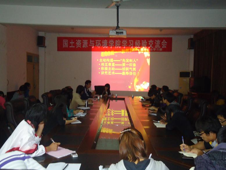 11 月1日 晚7点,由我院团委学生分会学习部开展的学习经验交流会在院办会议室顺利召开。到会的嘉宾有我院学工办程建华老师,土管081班陈梦娇(上届学习部部长),旅游091班房董祥(优秀学习委员代表),此外,我院团委学习部全体成员和各班学习委员及学生代表共计六十余人参加了交流会。