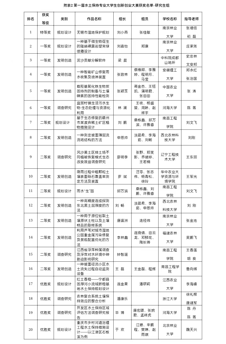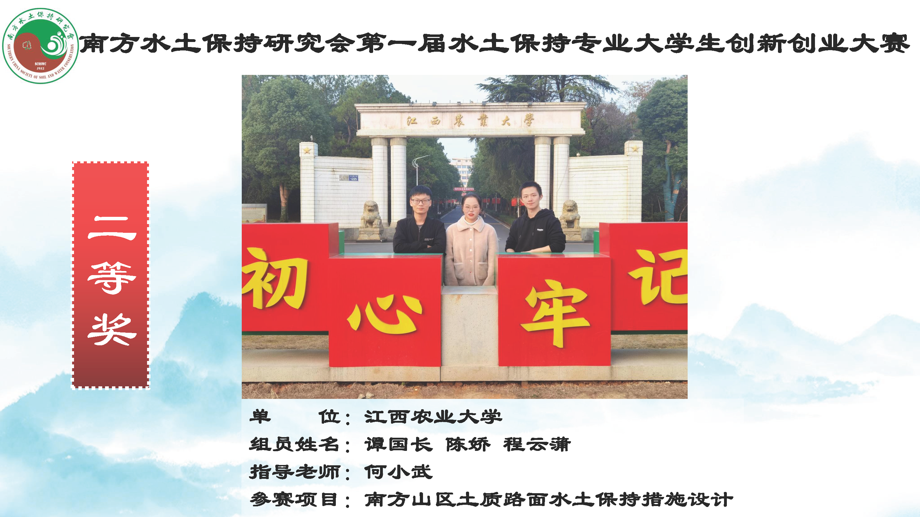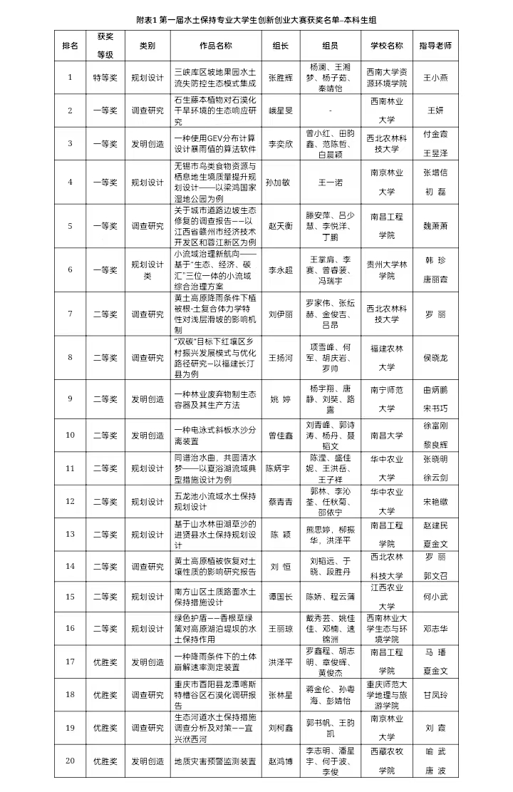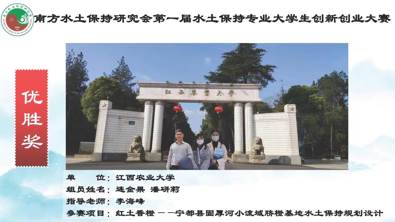 2022123日,南方水土保持研究会第一届水土保持专业大学生创新创业大赛颁奖仪式以线上形式成功举行,历时半年多的大赛圆满落幕。由我院学生谭国长、陈娇、程云蒲(指导老师:何小武)完成的参赛作品《南方山区土质路面水土保持措施设计》荣获本次大赛本科生组“二等奖”,我院学生连金果、潘研莉(指导老师:李海峰)完成的参赛作品《红土香橙——宁都县固厚河小流域脐橙基地水土保持规划设计》荣获大赛研究生组“优胜奖”。