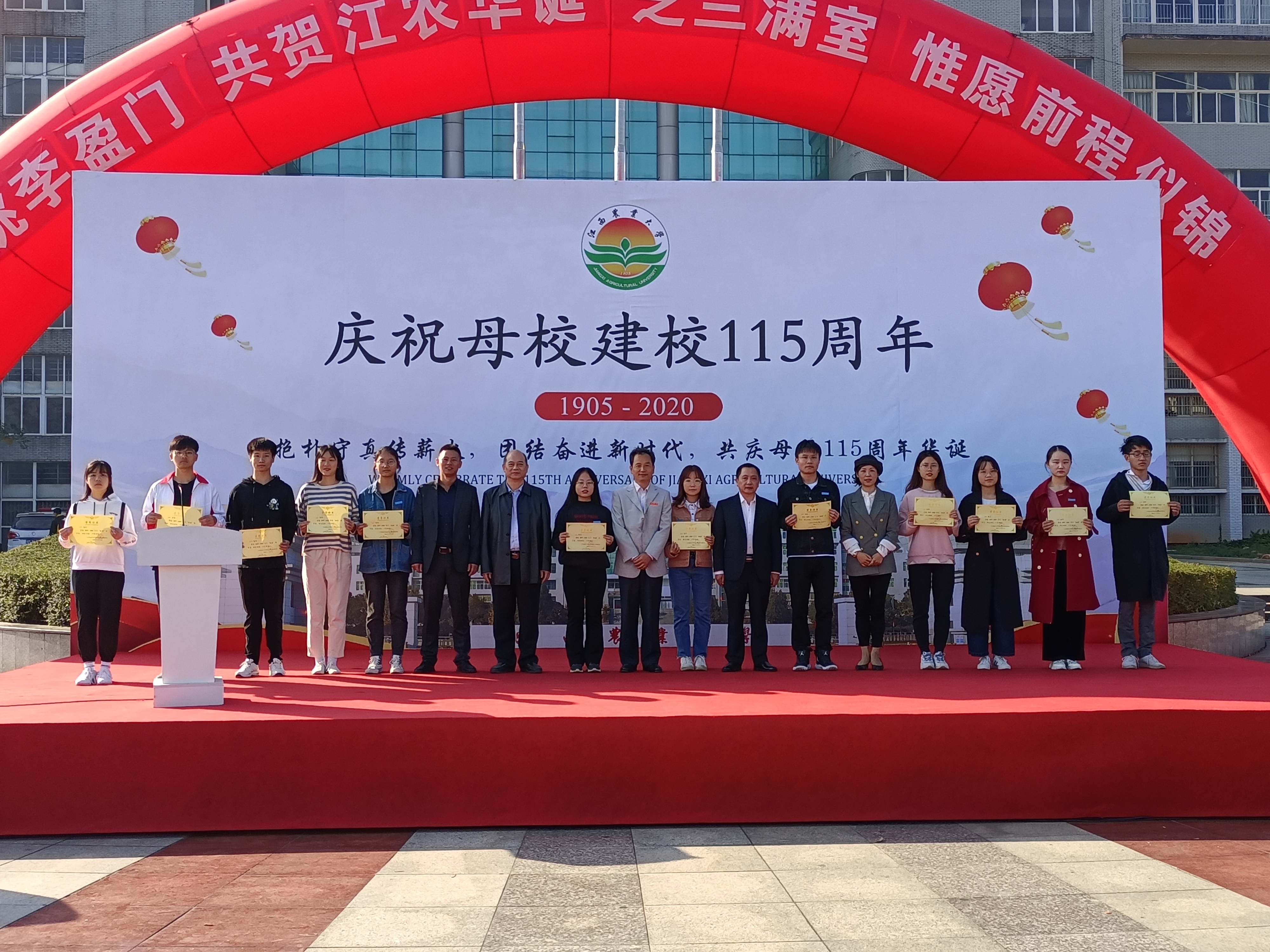 11月14日,在校庆周开幕式上,国土学院2020年度“地源”奖学金颁奖仪式在学校第五教学楼广场举行。学校副校长许斌华,江西地源土地房地产评估规划测绘有限公司董事长甘志强、副总经理余峰、行政及人力资源部主任阮慧珍和国土学院院长李保同教授为获奖的25名同学授奖。