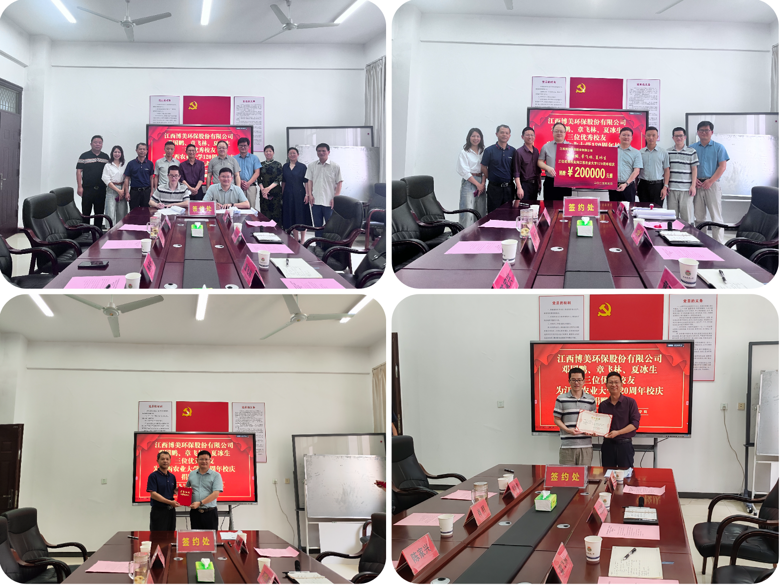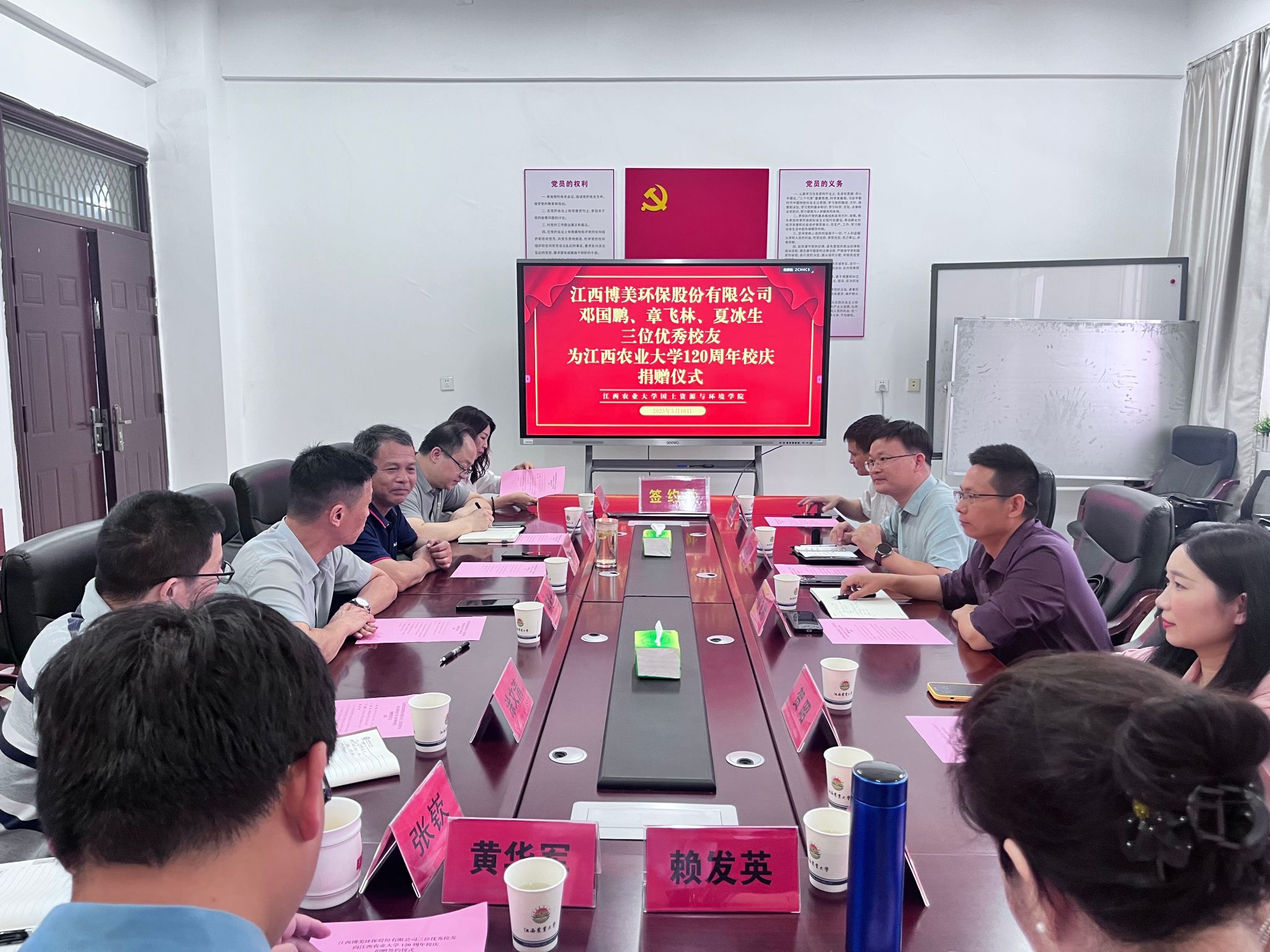 5月16日上午,江西博美环保股份有限公司(以下简称博美公司)向bat365中文官方网站建校120周年捐赠仪式在学院举行。博美公司董事长邓国鹏、副总经理章飞林、办公室主任贺昭,学校学生工作部(处)部(处)长陈家兴、校友工作服务中心主任黄新志,全体院领导及教师代表参加捐赠仪式。仪式由学院党委书记肖明主持。