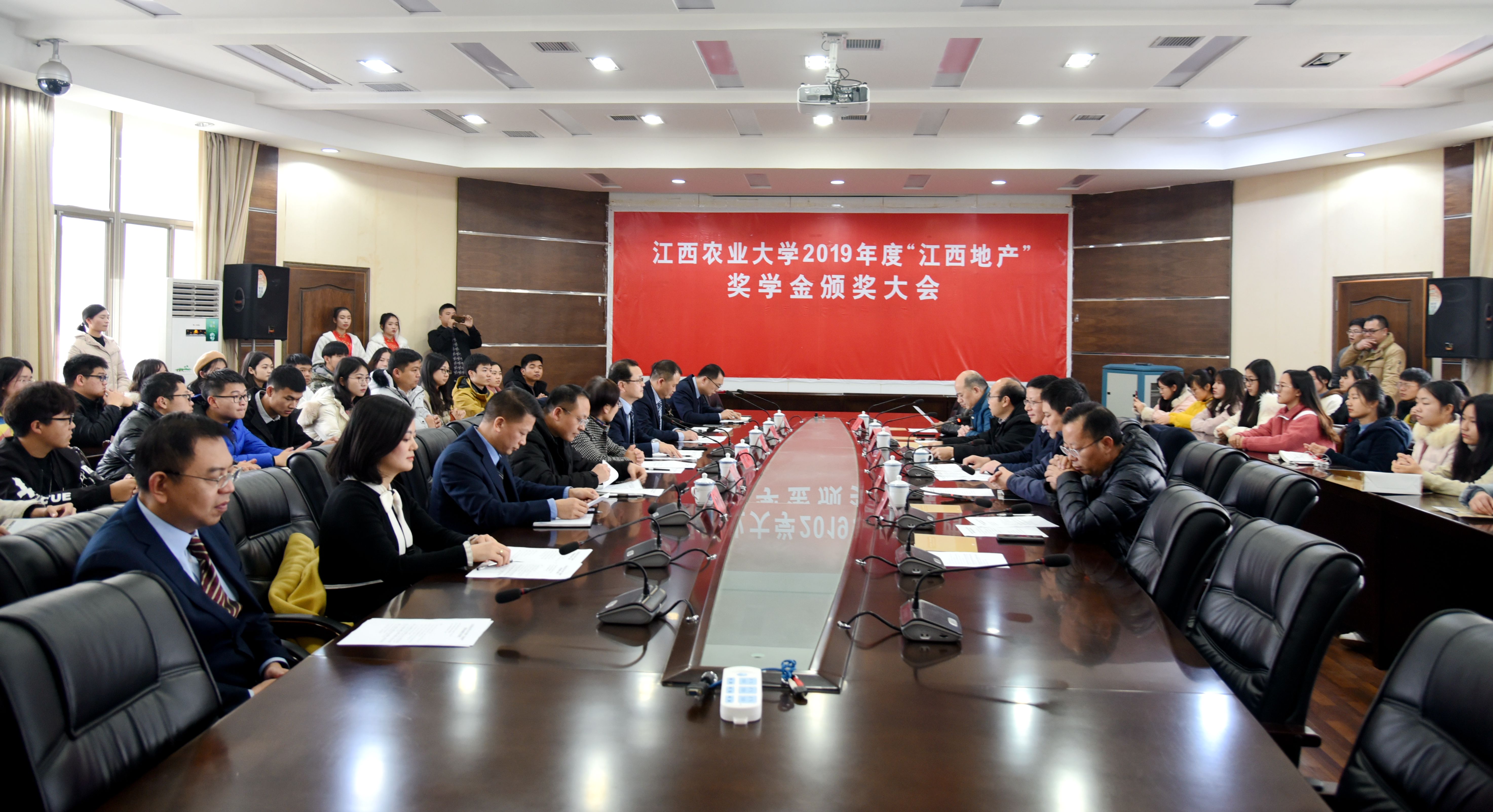 1月3日下午,bat365中文官方网站2019年度“江西地产”奖学金颁奖大会在校办公楼2楼会议室隆重举行。江西大成国资公司党委书记、董事长项文;江西大成国资公司党委办公室主任、董事会办公室主任、综合管理部总经理郭江槐;江西省地产开发集团党委书记、董事长龙兵;江西省地产开发集团党委委员、总经理盛振青;江西省地产开发集团党委委员、副总经理吴其生;江西省地产开发集团党委委员、副总经理文翠玉及地产开发集团中层干部职工代表来我校参加颁奖大会。我校校长赵小敏、副校长刘木华、研究生院院长蔡海生、学工处处长李剑富、国土学院党委书记郭旭、国土学院院长李保同等出席颁奖大会,获奖的22名研究生、本科生同学和部分本科学生代表90余人参加颁奖大会,副校长刘木华主持颁奖大会。