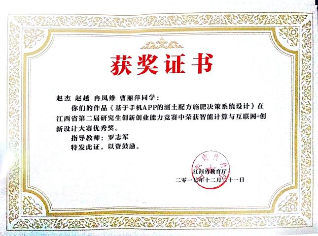 20171116日至17日,由江西省政府学位委员会、江西省教育厅主办的第二届研究生创新创业能力竞赛——智能计算与互联网+创新设计大赛在景德镇陶瓷大学新厂校区国家工程中心成功举行。为引导研究生在“双创”氛围中乘风破浪、激流勇进,我院积极鼓励学生参与第二届研究生创新创业能力竞赛。学生们以饱满的热情、敢于拼搏的胆识和科学的态度投入到创业创新竞赛中来,其中,研究生赵杰、赵越、冉凤维、曹丽萍团队与全省16所高校的2000余名研究生同台竞技并成功入围决赛。最终,他们的参赛项目“基于手机APP的测土配方施肥决策系统设计”获得优秀奖(指导老师:罗志军副教授)。