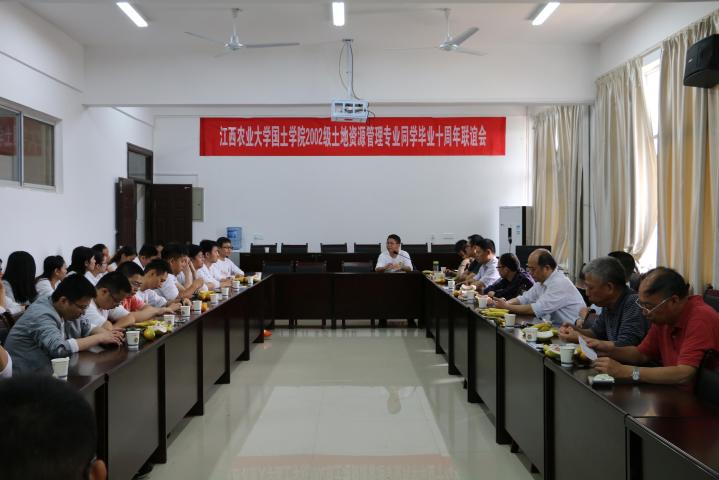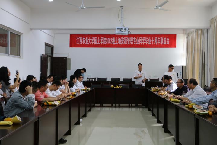 10月23日,我院2002级土地资源管理专业全体校友回母校开展毕业十周年联谊会,并在国土学院二楼会议室举行了师生座谈交流活动。学院院长李保同教授、院党委书记郭旭、院党委副书记赵刚、任课老师代表陈美球教授、牛德奎教授、周阳教授、蔡海生教授、周丙娟副教授及原国土学院团委书记陈家兴老师等出席座谈会。李保同院长代表学院致欢迎词并向校友们表达了深切的寄语。因班主任王景明老师外出无法参加座谈,陈家兴老师代为宣读了王老师对同学们毕业十周年聚会的致辞。周阳老师、陈美球老师代表任课老师发言,从如何延续同学情、走好人生路等方面表达了对校友们的殷切期望。校友们在聆听师长的谆谆教诲后,逐一向老师们汇报了各自毕业十年来的工作、家庭及生活等方面的情况,并表示一定会继续加强与学校的沟通与联系,特别是在毕业生实习和就业方面将给予母校的学弟、学妹们提供更多的帮助。随后,2002级土地资源管理专业全体校友们向国土学院赠送了一套乒乓球桌,以丰富老师们的业余生活,并向老师们赠送了“感谢师恩”毕业十周年特制纪念品。