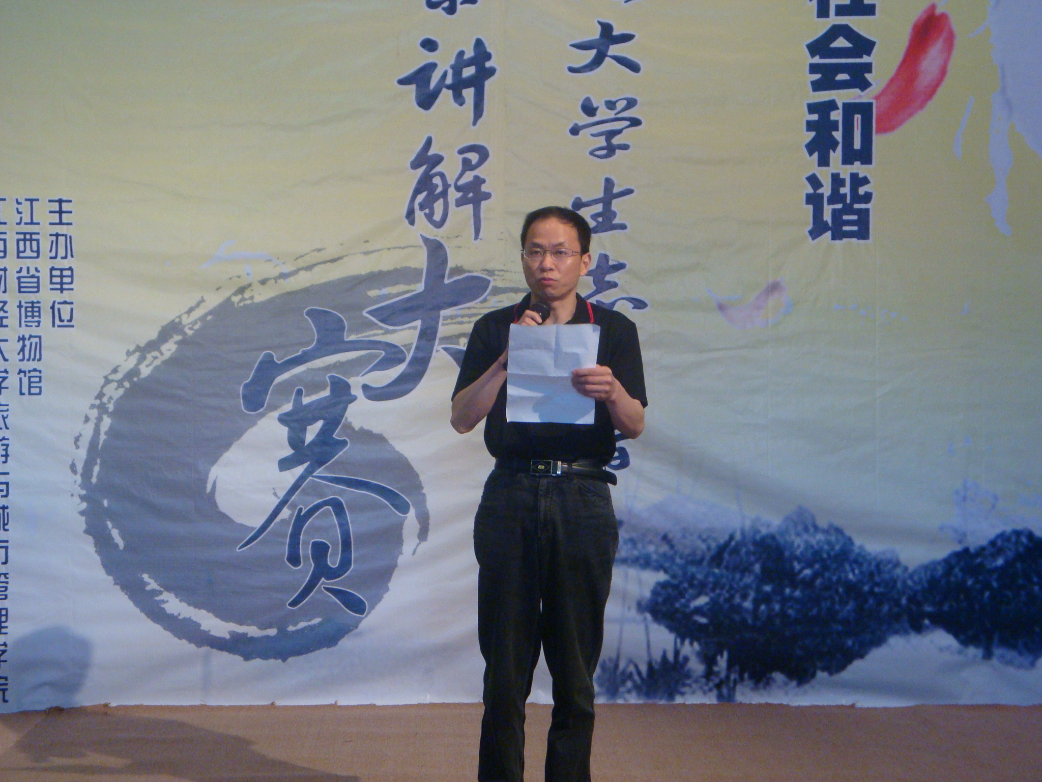 5月20日下午,在我校第三届导游之星大赛的总决赛上脱颖而出的前6名选手赴省博物馆参加以“博物馆促进社会的和谐”为主题的大学生志愿者现场情景讲解大赛。我院党委书记郭旭、省博物馆副馆长叶蓉、江西财大旅游与城市管理学院院长吴志军、省博物馆社教部主任沈农、我院团委书记陈家兴出席了大赛。